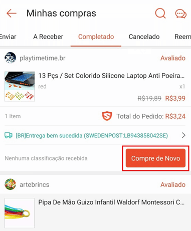 Exemplo de loop: ao listar os pedidos finalizados no aplicativo Shopee, é apresentada a opção Compre de Novo, o que conecta com a micro-interação de realizar pedido.