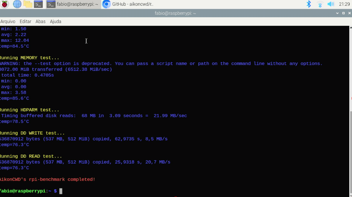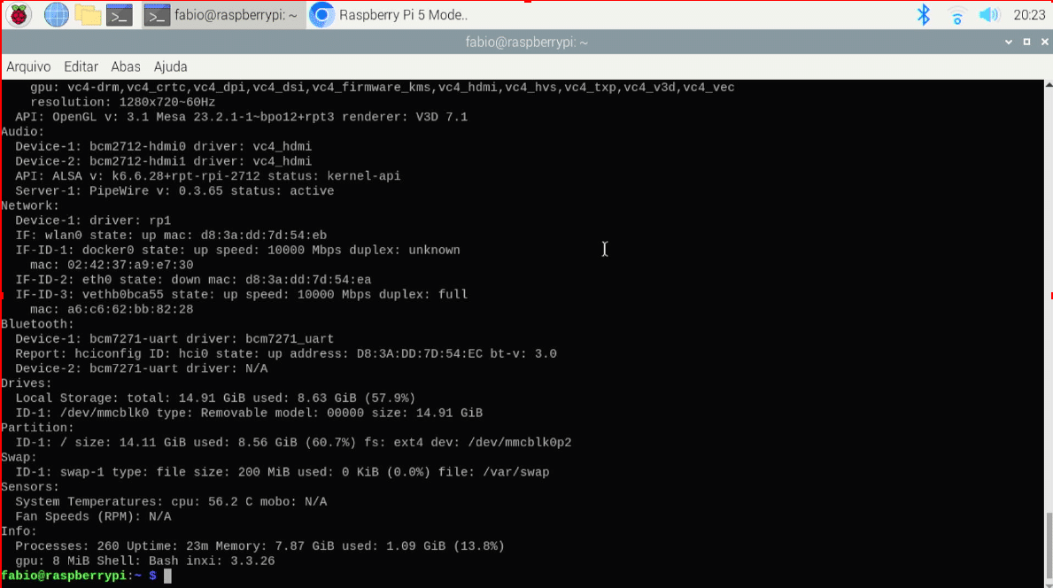 Com o sistema operacional Raspberry Pi OS instalado, conduzi os testes no modo desktop, conectando um monitor, mouse e teclado à placa. Observou-se uma notável melhoria na fluidez e rapidez ao abrir programas básicos de desktop, como navegadores e editores de texto.