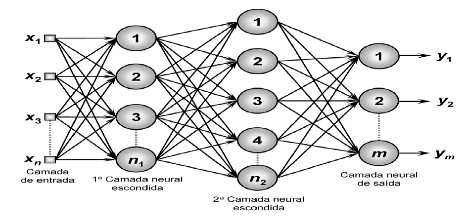 A camada de entrada é responsável pelo recebimento dos dados/sinais/amostras a serem analisados, assim como a correspondente associação com os pesos de entrada. A camada intermediária ou escondida tem por finalidade extrair as informações associadas ao sistema inferido, sendo também responsável pela maior parte do processamento destes dados. Já a camada de saída agrega os dados das camadas anteriores e ativa uma resposta adequada.