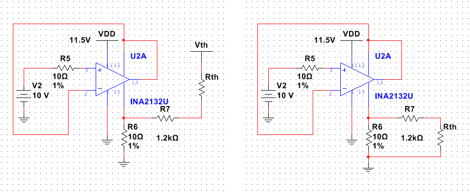 Com base na nomenclatura da simulação (note que é diferente do esquemático anterior) podemos realizar algumas análises. Podemos transformar o trimpot em um equivalente de Thevenin que representará este circuito através de uma fonte de tensão de Thevenin em série com um resistor equivalente. Este circuito equivalente estará em série com o resistor R7. Neste ponto é possível visualizar que temos um novo divisor resistivo formado por esses elementos em série e o resistor de 10 Ω. Ou seja, apenas uma pequena parcela da tensão disponibilizada no trimpot será aplicada na entrada não inversora para correção do offset.