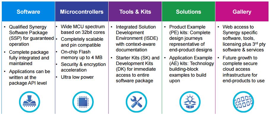 A Renesas introduziu em outubro de 2015, no Renesas DEVCON 2015, uma plataforma de desenvolvimento para sistemas embarcados chamada Synergy. É uma solução diferente das que conhecemos atualmente pois integra diversos aspectos do desenvolvimento com microcontroladores numa mesma solução. Entenda, o Renesas Synergy é uma solução que engloba software e hardware. Faz parte do Renesas Synergy 4 séries de microcontroladores, uma linha nova de silício, todos com core ARM Cortex-M0 ou Cortex-M4, escaláveis entre si e com pinos compatíveis, memória Flash de até 4MB e características de segurança e criptografia inclusas no chip, além de características de baixo consumo. A linha é apresentada como:
