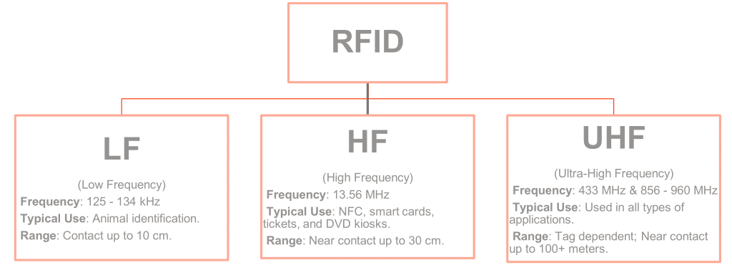 - LF (low frequency): de 30 kHz até 300 kHz. As etiquetas desta faixa de frequência são fabricadas em 125 kHz ou 134,2 kHz. Geralmente são etiquetas passivas e seu maior uso é na identificação de animais e rebanhos;