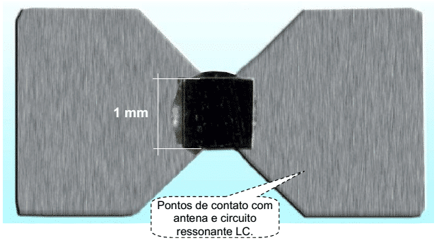 Este circuito é encapsulado e os pontos de contato são soldados na parte física da antena. A grande vantagem deste sistema é que mesmo para uma razoável quantidade de dados a memória necessária já atingiu um ótimo grau de miniaturização. Com isso, consegue-se encapsulamentos da ordem de 1 mm2, como o mostrado na figura 4.