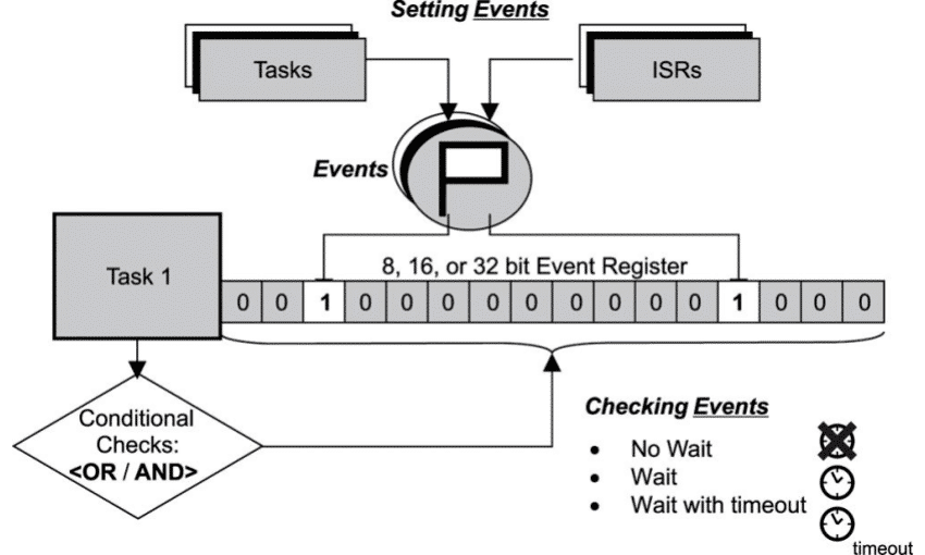 Os G.E são variáveis de 16 ou 32 bits (definido pelo usuário) onde cada bit é uma flag específica indicando que algo ocorreu ou não. Nos nossos exemplos, usaremos os grupos de eventos de 32 bits, sendo 24 bits de uso livre e 8 reservados. Já que cada objeto do grupo de eventos permite manipular até 24 eventos diferentes, dependendo do tamanho do seu projeto, pode-se economizar uma preciosa quantidade de memória RAM, comparado com o uso de semáforos binários ou queues para cada evento.
