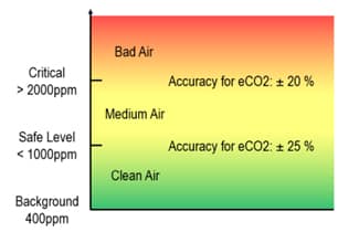 Precisão: A precisão do sensor refere-se à variação máxima entre os valores reais e exibidos na saída. Pode ser expresso como uma percentagem da escala completa ou em termos absolutos. Os módulos de sensores MEMS normalmente incluem dados pré-calibrados armazenados na memória não volátil (NVM) do módulo. O sensor usa os coeficientes de calibração no NVM para produzir medições estáveis. Ele pode ser operado com um desvio máximo de ±1% durante a vida útil do módulo. Um exemplo da precisão do sensor de gás MEMS RRH46410 na medição da qualidade do ar interno para CO2 é mostrado na Figura 2.