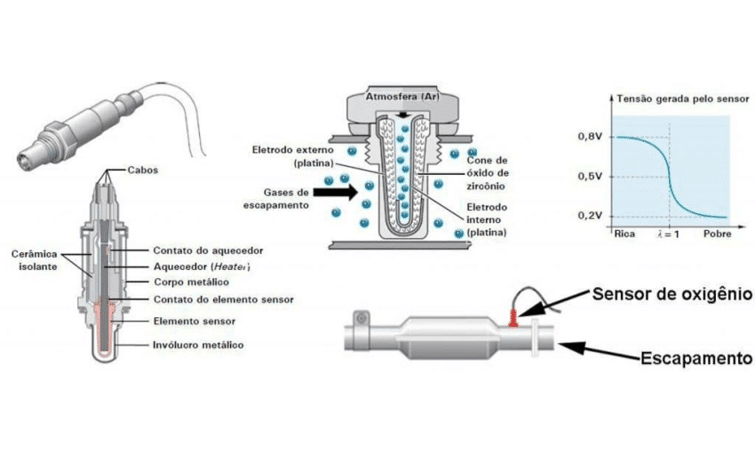 Para atingir a temperatura ideal de operação do sensor em poucos segundos, a sonda lambda possui quatro ligações, sendo duas para enviar o sinal elétrico do sensor até a UCM e as outras duas para controlar o aquecedor elétrico. O sensor de oxigênio opera em função da diferença da concentração de oxigênio entre o gás de exaustão e uma amostra de referência do ar externo, gerando uma diferença de potencial elétrico entre os eletrodos de platina, oscilando entre 200 e 800mV, dependendo do teor de oxigênio presente nos gases de exaustão.