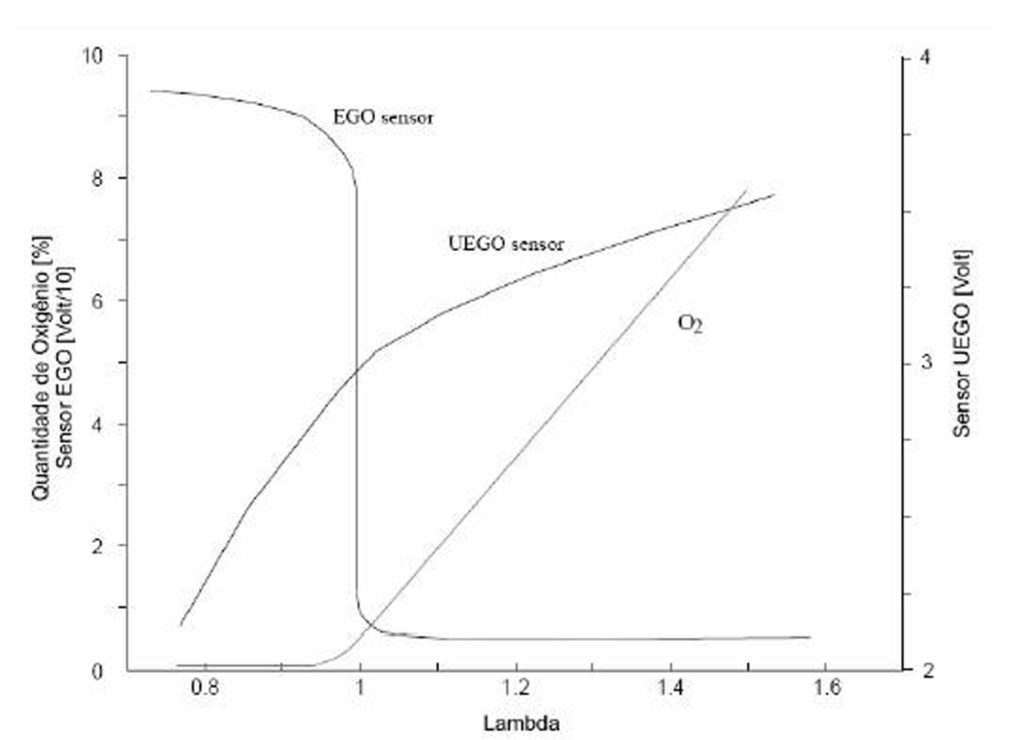 O sensor de oxigênio, também denominado de sonda lambda, é capaz de medir a concentração de oxigênio nos gases de exaustão e, com base nessa informação, é possível estimar o valor real do fator lambda descrito no artigo “Motores de combustão interna ciclo Otto”. O sensor mais utilizado atualmente é o EGO (Exhaust Gas Oxygen), também conhecido como sonda lambda de banda estreita (Narrow Band Lambda Sensor). Outro sensor de oxigênio é o UEGO (Universal Exhaust Gas Oxigen), também chamado de sonda lambda linear ou sensor lambda de banda larga (Wideband Lambda Sensor). Com esse sensor, é possível medir o valor exato do fator lambda, o que possibilita o controle da mistura também fora da região estequiométrica. A figura 7 ilustra os sinais elétricos fornecidos por esses sensores. Eles precisam de uma temperatura de operação acima de 400ºC para que sua saída seja válida. Deste modo, os sensores usados atualmente são pré-aquecidos eletricamente.