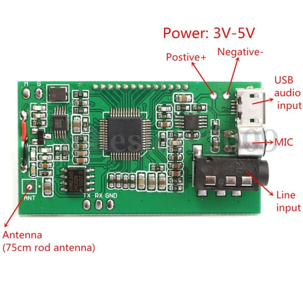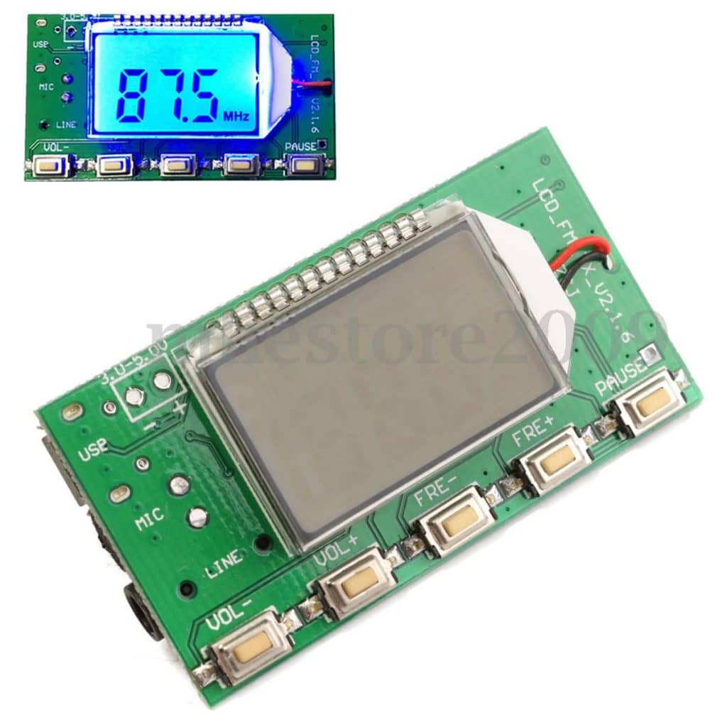 Esse módulo é facilmente comprado no ebay por menos de 6 dólares e é encontrado com a seguinte descrição: DSP PLL 87-108MHz Digital Wireless Microphone Stereo FM Transmitter Module Board.
