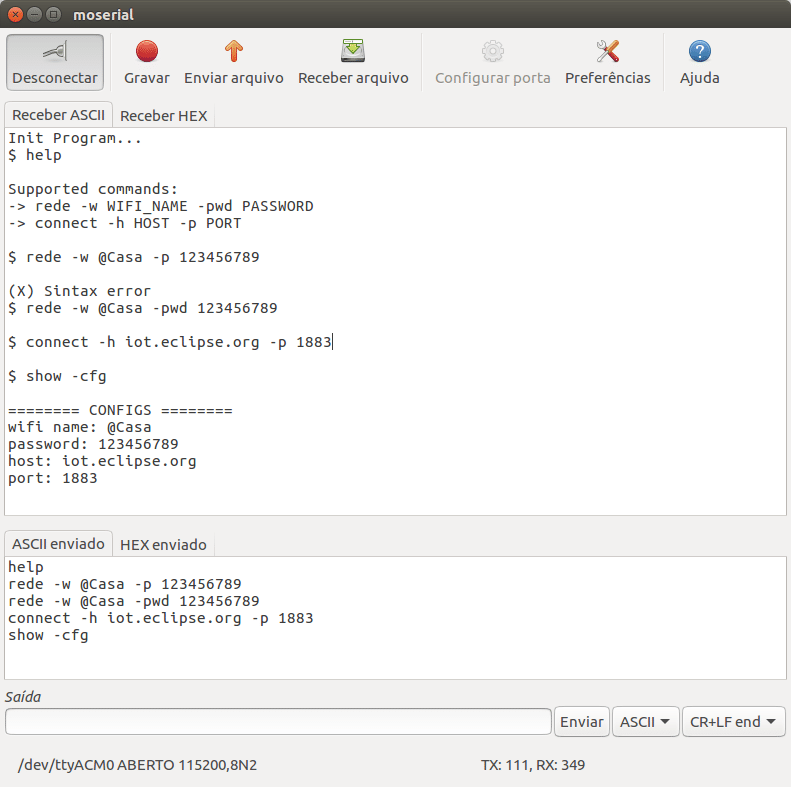 Ao enviar um comando com sintaxe errada podemos ver a aplicação informando a mensagens “(X) Sintax error”.