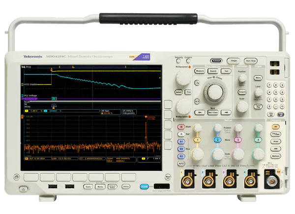 O tipo de display incorporado nas ferramentas também pode influenciar o tamanho e o preço. Osciloscópios de sinal misto autônomos, como a série Tektronix Mixed Domain MDO4000C, são osciloscópios robustos e versáteis que podem lidar com muitas aplicações complexas (Figura 1). O display integrado XGA permite que os usuários inspecionem visualmente formas de onda e medições, enquanto a conectividade Ethernet e USB integrada facilita a integração em uma bancada de teste flexível e expansível.