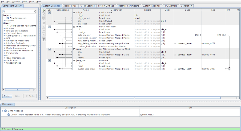 Para visualizarmos o SOPC que já está pronto neste appnote, clique em Tools > Qsys. Se um formulário de procura de arquivo aparecer, selecione o arquivo niosii_system.qsys. A seguinte janela irá se abrir: