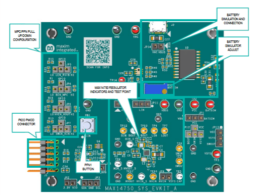 O sistema de avaliação integrado Maxim MAX14750EVSYS inclui uma placa de avaliação MAX14750, a placa de interface MAXPICO2PMB I2C e dois cabos USB. A placa de avaliação pode se conectar a um PC usando a placa de interface I2C, permitindo que o usuário use um software de interface gráfica do usuário (GUI) para programar várias funções e ler o status do dispositivo. A Figura 1 mostra a placa.