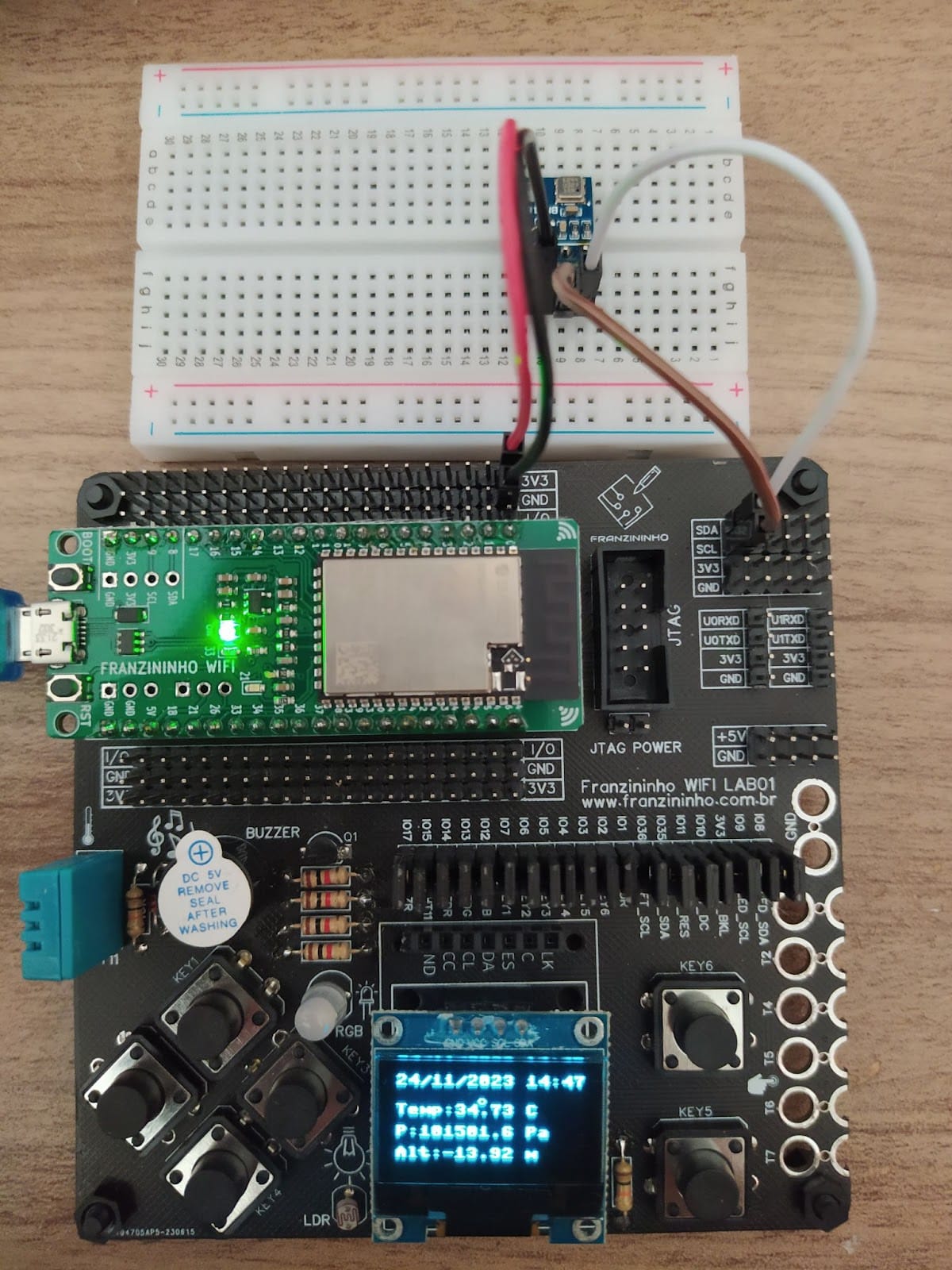 Este projeto visa capturar dados de pressão, temperatura e altitude e exibi-los de maneira clara e objetiva no display OLED SSD1306. Para isso, utilizaremos a comunicação I2C e os GPIOS da Franzininho WiFi Lab01.