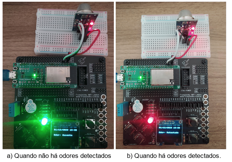 oled = ssd1306.SSD1306_I2C(oled_width, oled_height, i2c) No loop principal definimos a condição em que, ao detectar um sinal pelo sensor, a mensagem “odor: detectado” será apresentada no display, e o LED vermelho será aceso. Do contrário, se nenhum sinal for detectado, uma mensagem indicando a normalidade do ar, “odor: ausente”, será exibida, enquanto o LED vermelho se apaga, permitindo que o LED verde assuma o destaque.