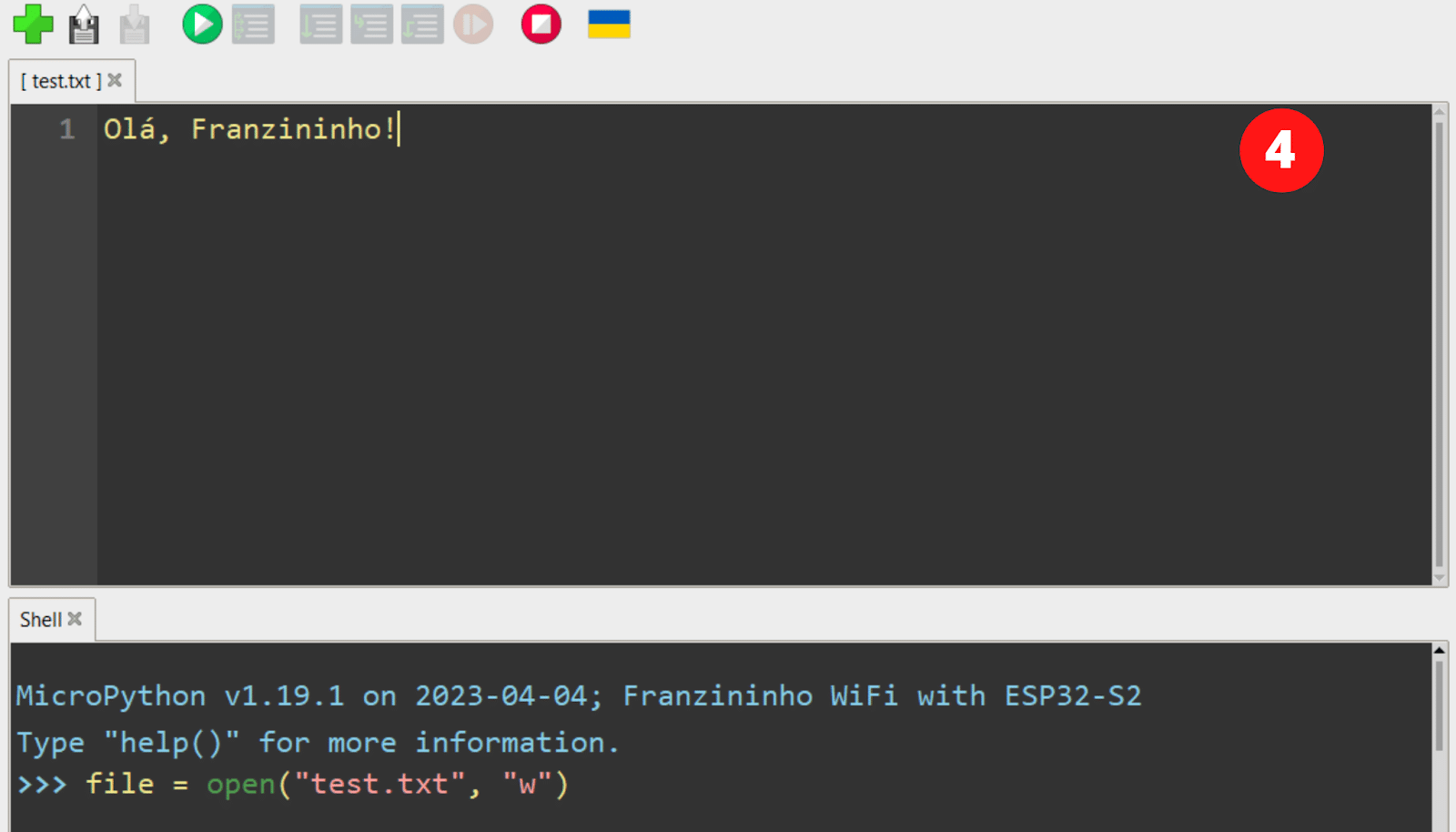 file.write("Olá, Franzininho!")Ao pressionar o ENTER no final desta linha, você verá o número 18 aparecer como retorno do comando. Isso é o MicroPython confirmando que ele escreveu 18 bytes no arquivo que você abriu. Conte o número de caracteres na mensagem que você escreveu: incluindo as letras, acento, vírgula, espaço e ponto de exclamação, há 18 – cada um dos quais ocupa um byte.