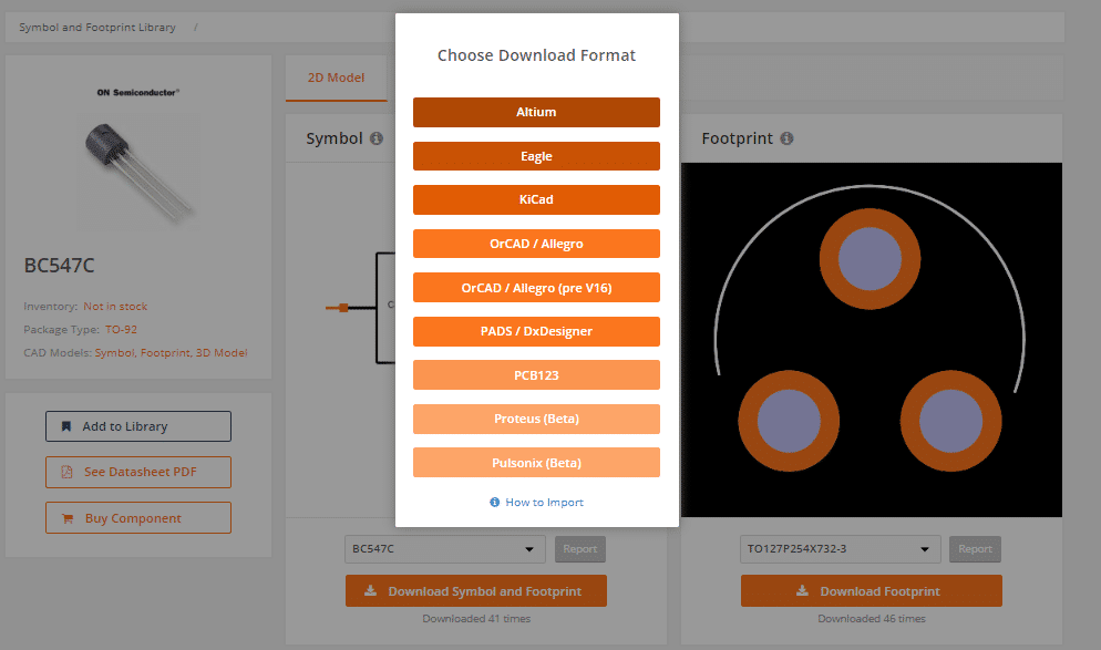 Após escolher o componente, temos a sua página. Aqui temos as abas “2D Model” e “3D Model”, porém o arquivo 3D é disponibilizado apenas para membros premium.