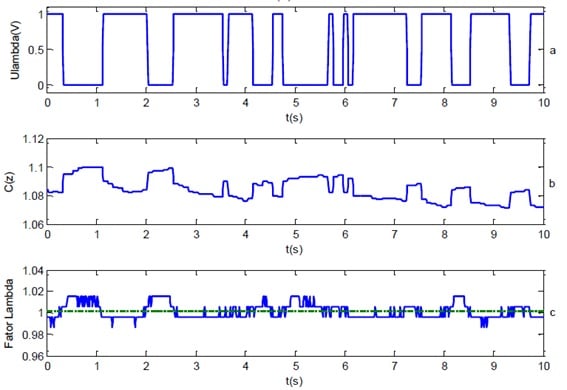 Como a intensidade das perturbações aumentou, o controlador levou aproximadamente 2 s para se ajustar ao erro de estado estacionário, conforme mostrado na figura 4b. A média do fator lambda foi de 1,038 em malha aberta para 1,002 com o controle em malha fechada (figura 4c), enquanto que o fator de multiplicação do controlador teve média de 1,031. Nesse caso, o sinal do sensor lambda apresentou grande variação após a correção do erro de estado estacionário devido à intensidade da perturbação na massa de combustível.