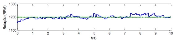 A rotação do motor (figura 9) se manteve com média no valor de 1200 RPM e teve variação de apenas ±25 RPM, indicando boa estabilidade do sistema com o controlador ativo.