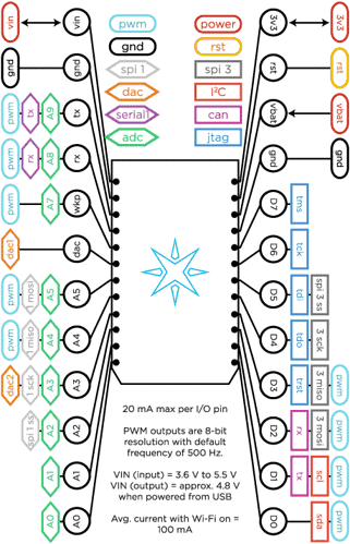 Essa placa possui um microcontrolador e um módulo Wi-Fi e vem pronta para facilmente integrar as aplicações que exigem conectividade e que sejam simples de programar em alto nível. Seus componentes: