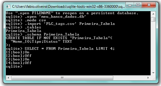 A partir desse ponto estamos prontos para executar operações no banco de dados. A priori solicitaremos a exibição de apenas quatro dos seis registros já existentes na nossa tabela através do comando SELECT * FROM “nome da tabela” LIMIT “quantidade de registros”. Vale ressaltar que tais registros já existem por terem sido inseridos no ato da edição do arquivo “PLC_tags.csv” que deu origem a “Primeira_Tabela”. Veja a sintaxe aplicada a seguir: