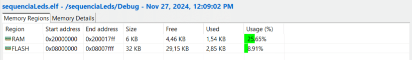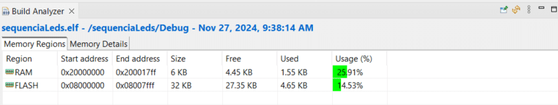 Essa ferramenta fornece uma visão do uso de memória do projeto. Com o nosso projeto, utilizando drivers da HAL, foi registrado um uso de 14,53% da memória flash.