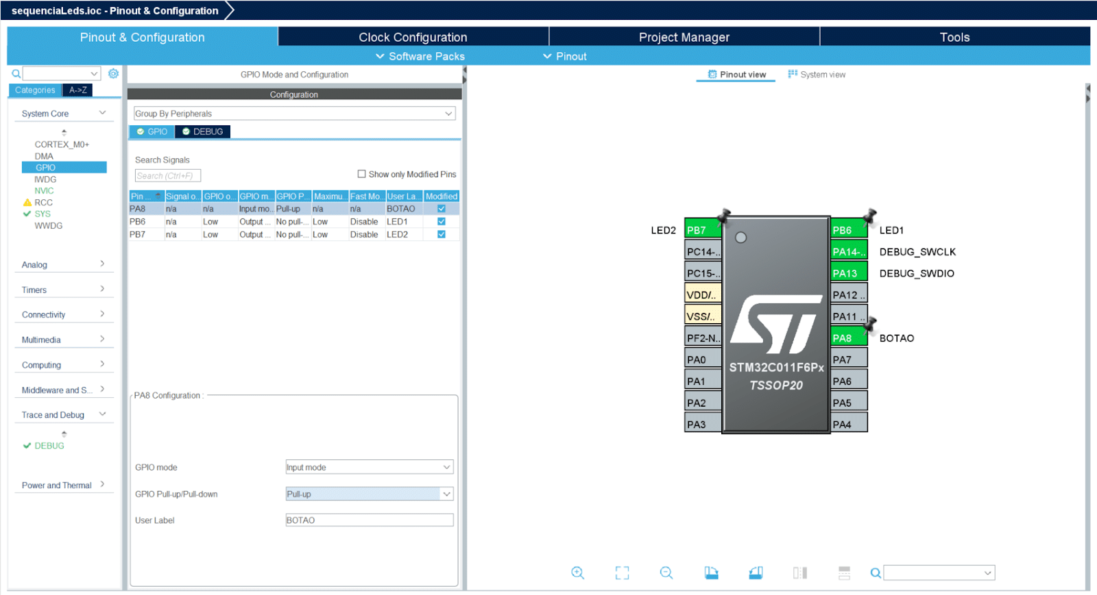 - Depois, selecione o pino “PA8” como “Gpio_Input” e renomeie a Label para “Botao”.