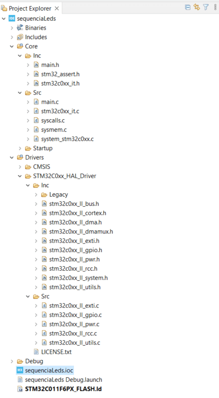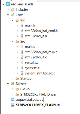 Observe a estrutura e o código criado no arquivo ‘main.c’. Note que todas as funções, como a inicialização da GPIO, utilizam os drivers da HAL.