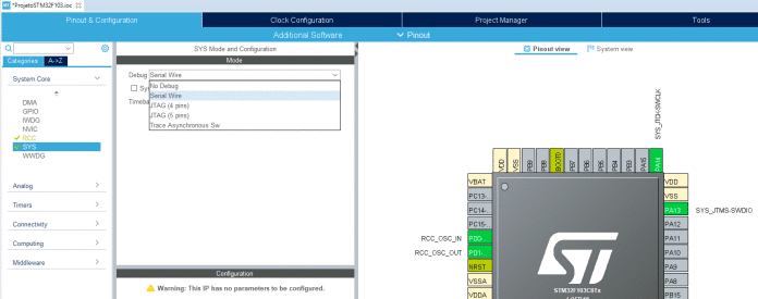 Nota-se que os pinos PA13 e PA14 foram configurados neste momento para receber o SWCLK e SWDIO do ST-Link/V2. Outro parâmetros que temos de opção nesta etapa de configuração é o “Timebase Source”, vamos deixar-la do jeito que está, na opção “SysTick”, essa opção utiliza o timer interno de 24b para dar parâmetros de tempo para funções de delay e etc, e futuramente será utilizado em tutoriais que serão publicados nessa série em conjunto com FreeRTOS e alguns dos periféricos da linha STM32F1xx.