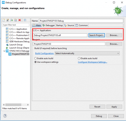 Iremos agora configurar a ferramenta de debug e download do firmware, então seguimos os passos “Run → Debug Configurations → 2x click em STM32 MCU Debugging”. Próximo passo é configurar o campo “C/C++ Application”, referenciando o arquivo “xxxx.elf” salvo no diretório do seu projeto, como demonstrado na figura 17.