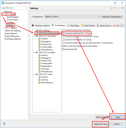 Será aberta a janela de configuração, siga os passos da figura 13 a seguir para chegar na opção “Tool Settings” fazendo os passos: “C/C++ Build → Settings → Tool Settings → MCU Post build outputs”. Neste momento, marcaremos o checkbox “Convert to Intel Hex File (-O ihex)” e clicaremos na opção “Apply” e “Apply and Close”.
