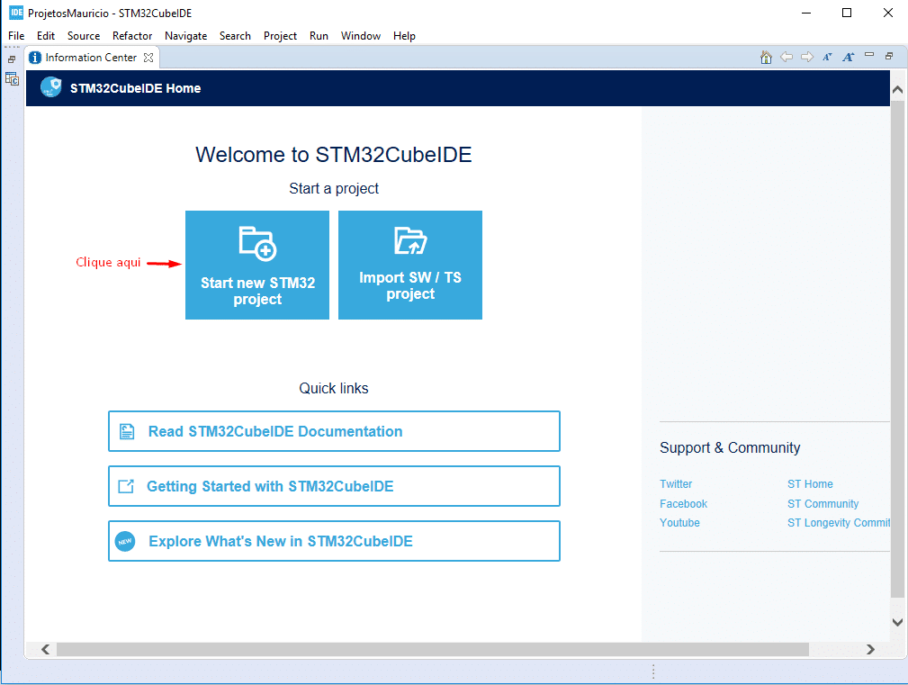 - Primeiro, faça o download da IDE neste link, instale e use as recomendações: https://www.st.com/en/development-tools/stm32cubeide.html