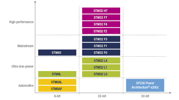 Esta família de MCU é considerada convencional, mas a ST também possui linhas dedicadas para baixo consumo de energia (STM8L) e para automobilística (STM8AL e STM8AF). Para nos auxiliar na definição de qual modelo idealizar, a fabricante identifica as famílias por segmento, como ilustrado na figura 2: