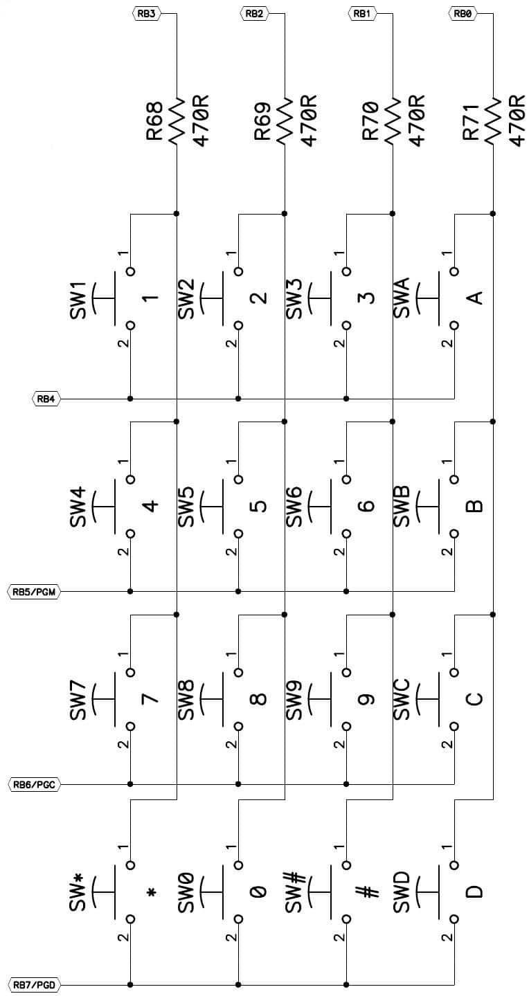 Na leitura matricial dispõe-se os grupos de chaves separados em colunas, de modo que seja possível ligar uma coluna por vez. Isto pode ser feito utilizando terminais de saída para acionamento de cada coluna e terminais de entrada para a leitura das linhas. É muito comum utilizar resistores de pull-ups na entrada do microcontrolador ou, caso o microcontrolador possua, pull-ups internos das próprias entradas. Para proteger o sistema de curto entre os terminais, geralmente se utiliza resistores em série nas saídas a serem controladas. Um modelo deste circuito é apresentado na figura 1.