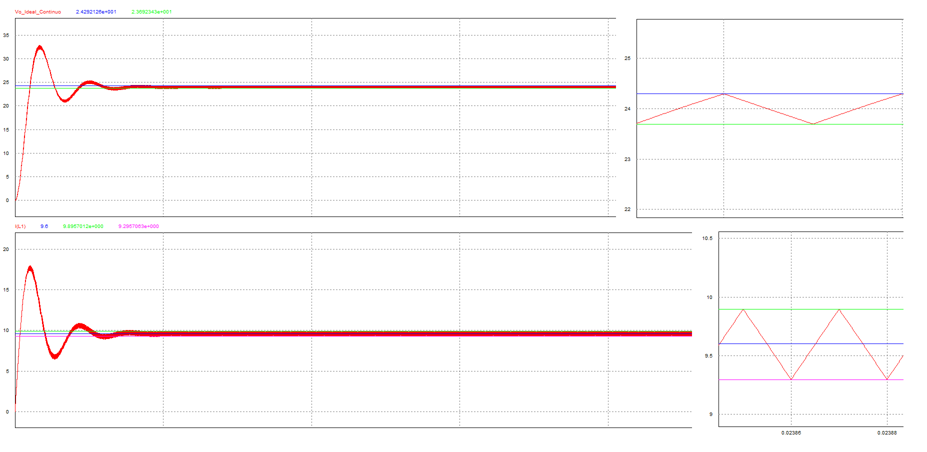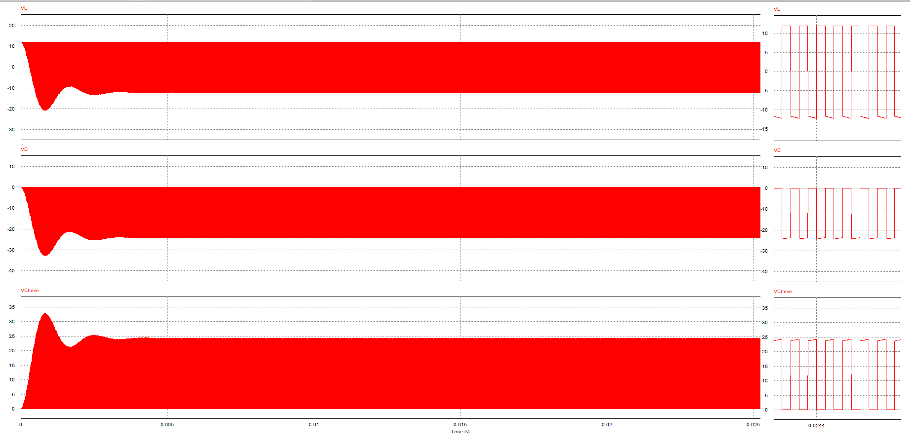 Foi verificado que os modelos adquiridos através da técnica dos mínimos sinais são satisfatórios em relação ao comutado e valem para um ponto de operação do sistema. As simulações do circuito comutado apresentam incoerências em alta frequência, devido ao passo de cálculo, pois foi utilizado um de tamanho maior ao necessário devido ao tempo de simulação ou até um bug na ferramenta, que acontece no mundo real.