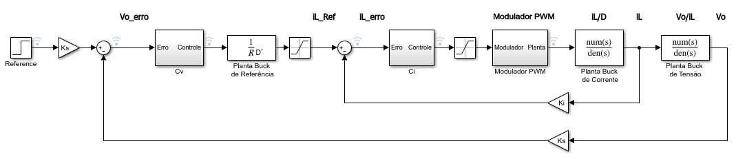 A principal malha do conversor é a de corrente no indutor L. Basicamente o ciclo de trabalho variará e assim controlará a corrente no indutor para variar a tensão na carga. Existem malhas secundárias para controlar a tensão na carga, exercendo referência para a de corrente.