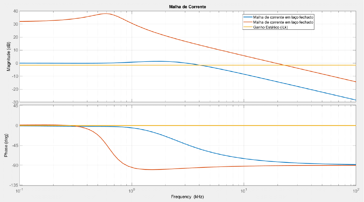 Para realizar a análise da malha de tensão é necessário uma função de transferência com ordem superior a segunda, para simplificar, analisa-se a resposta em frequência em laço fechado da malha de corrente, que pode ser visualizado na Figura 28 .