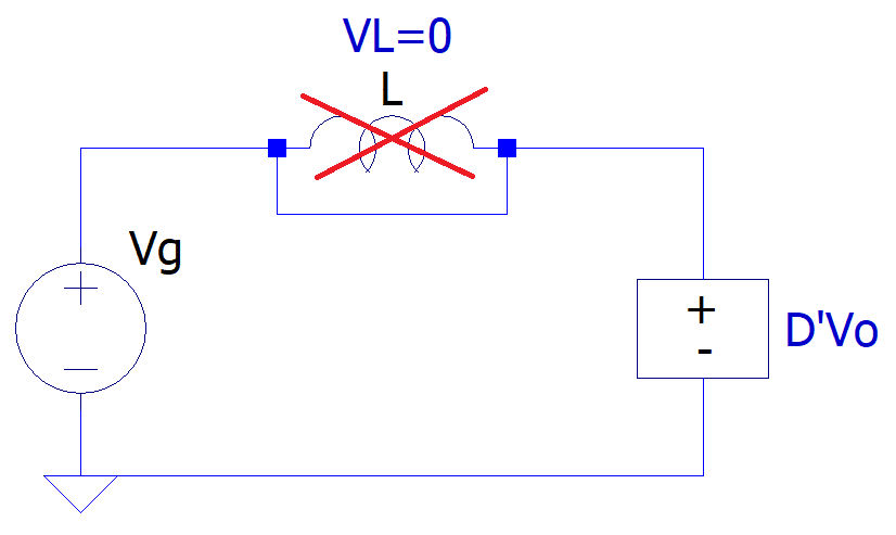 A tensão no indutor quando a chave esta fechada é , e quando está aberta, . Desta maneira, tem-se em regime: , sendo D o ciclo de trabalho (razão entre tempo de chave fechada e período de chaveamento) e T o período da frequência de chaveamento e D’ razão entre o período com chave aberta e período de chaveamento.