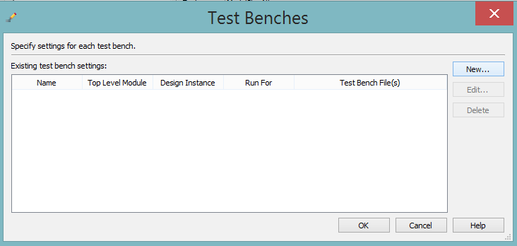 E então aparecerá a seguinte janela para setar os testbenches. Clique em New e selecione o arquivo de testbench.