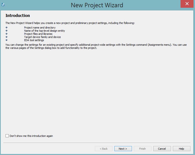 Neste post vou explicar como fazer seus projetos no Quartus da Altera. O Quartus é uma IDE fácil de usar que permite que se crie projetos em Verilog, VHDL ou System Verilog e permite que se sintetize para FPGAs da Altera. Para aprender Verilog e fazer simulações, no entanto, é uma excelente IDE, simples de utilizar e bem conhecida. A seguir mostro como criar seu primeiro projeto utilizando essa IDE com várias telas para guiá-lo durante o processo de configuração do primeiro projeto. Seguir esse tutorial leva no máximo 30 minutos para quem nunca utilizou o software. Estou utilizando o Quartus 13.0 SP1, mas o mesmo tutorial também é valido para as versões que foram lançadas após essa, incluindo a versão 14 e 15.