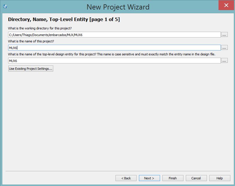 Eu utilizei um nome para meu projeto como MUX6 e selecionei uma pasta para meus trabalhos.