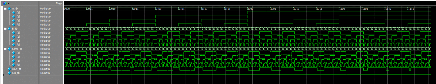 Para injetar valore e 0 a 15 em A e de zero a 15 em B, criei dois contadores, i e j. Os valores de i, injetei em A, os valores de j, injetei em B. Fiz dois testes que mostrariam uma mensagem de erro quando executasse o Testbench, uma testando o Carry e outra testando a soma. O testbench está abaixo.