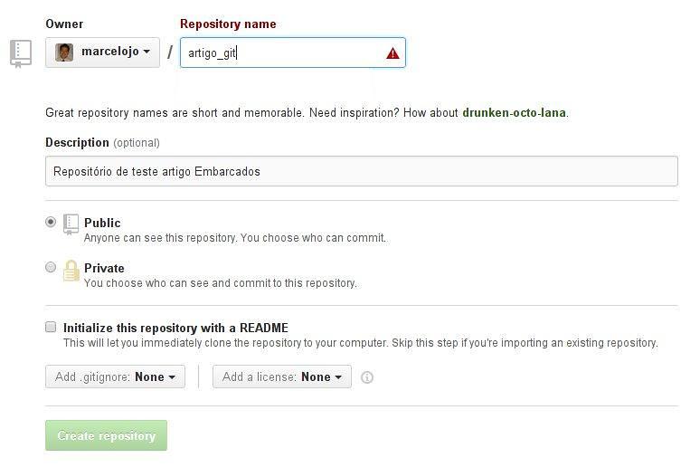 git remote add origin https://github.com/marcelojo/artigo_git.git git push -u origin master Username for 'https://github.com': marcelojo@gmail.com Password for 'https://marcelojo@gmail.com@github.com': Counting objects: 6, done. Delta compression using up to 8 threads. Compressing objects: 100% (3/3), done. Writing objects: 100% (6/6), 489 bytes | 0 bytes/s, done. Total 6 (delta 0), reused 0 (delta 0) To https://github.com/marcelojo/artigo_git.git * [new branch] master -> master Branch master set up to track remote branch master from origin.