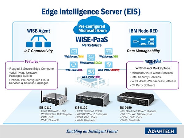 O Edge Intelligence Server (EIS) facilita a conectividade IOT, gerenciando os dados e as análise edge, fornecendo soluções integradas que incluem o pacote de software WISE-PaaS integrado para atender a uma variedade de requisitos de aplicativos diferentes e também fornece ferramentas de desenvolvimento abrangentes e SDKs com protocolos padrão (Modbus / OPC / MQTT) para sensores e outros dispositivos.