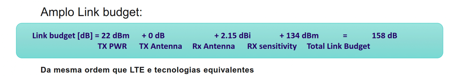 - O “link budget” muito bom da tecnologia Sigfox. O link budget é a soma da sensibilidade da estação base, da potência de saída do dispositivo e ganhos de antena. Ele indica quanto o sinal pode ser atenuado e ainda assim se ter uma recepção perfeita. Na tecnologia Sigfox o link budget é de 158dB, da mesma ordem de LTE e NB-IOT;
