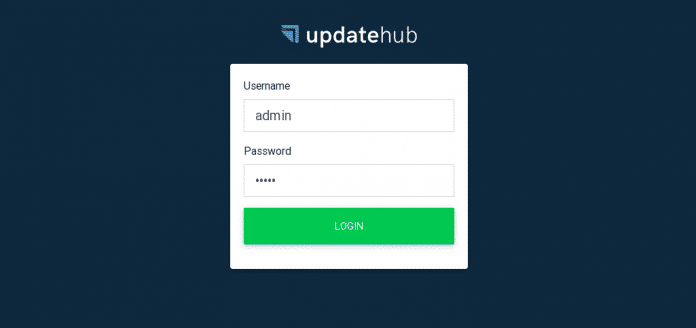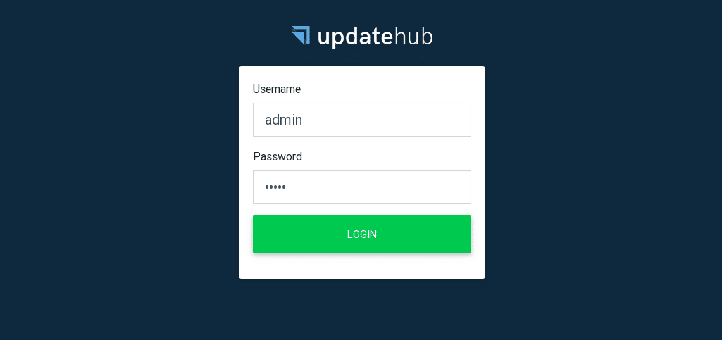 Pacote criado, agora já estamos prontos para adicionar o pacote ao updatehub-ce. Abra o seu navegador e digite URL do servidor (por exemplo <seu-endereço-ip>:8080), abrirá uma página de login, por padrão o login e senha devem ser preenchidos por admin, preencha os campos e aperte login.