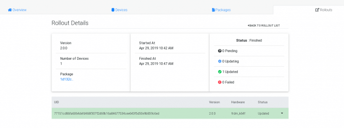 O dispositivo inicializará com a nova imagem e consultará o servidor se há alguma outra atualização, o servidor irá retornar para o dispositivo que não há mais atualizações e o Rollout será definido como atualizado (Updated).