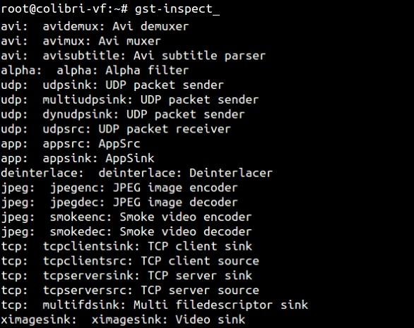 Agora com o comando gst-inspect você pode vizualizar os plugins e elementos instalados anteriormente. Abaixo alguns exemplos de plugins e elementos instalados.