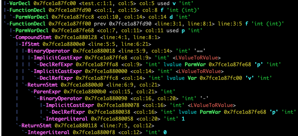 Já a AST produzida pelo Clang para o mesmo programa test.c é a seguinte.