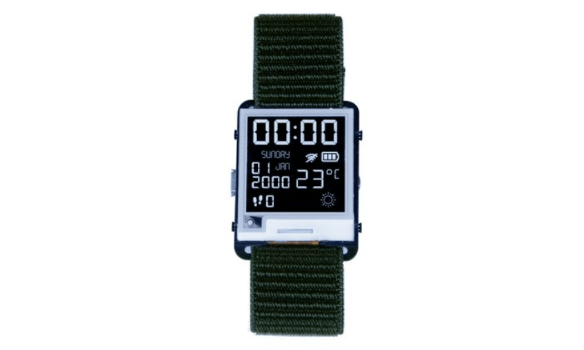 Como já dito, o projeto Watchy foi baseado no SoC ESP32. Foi desenvolvida uma placa compacta que abriga o ESP32, RTC, acelerômetro, conversor USB Serial, motor, antena, botões e conectores. Como display, foi escolhida uma tela do tipo e-paper de 1.54″ com 200 x 200 px.