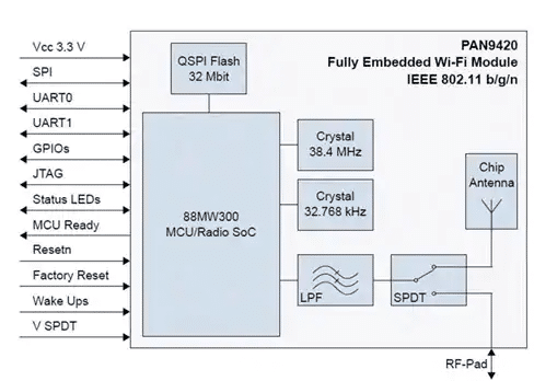O módulo Panasonic PAN9420 Embedded Wi-Fi suporta o padrão Wi-Fi 802.11 b / g / n a 2.4GHz. Ele tem uma unidade central de processamento integrada (CPU) para executar uma pilha IP de rede completa junto com um servidor Web, memória de acesso aleatório estática interna (SRAM) e memória flash programável no sistema (Figura 1). O módulo suporta os modos de ponto de acesso e de infraestrutura simultaneamente, para facilitar a configuração de conexões Wi-Fi simultâneas para dispositivos inteligentes e roteadores de rede doméstica. O firmware também suporta aplicações no modo cliente, micro-ponto de acesso e ad-hoc. Ele também pode receber atualizações pelo ar, um recurso de importância vital para dispositivos IoT.